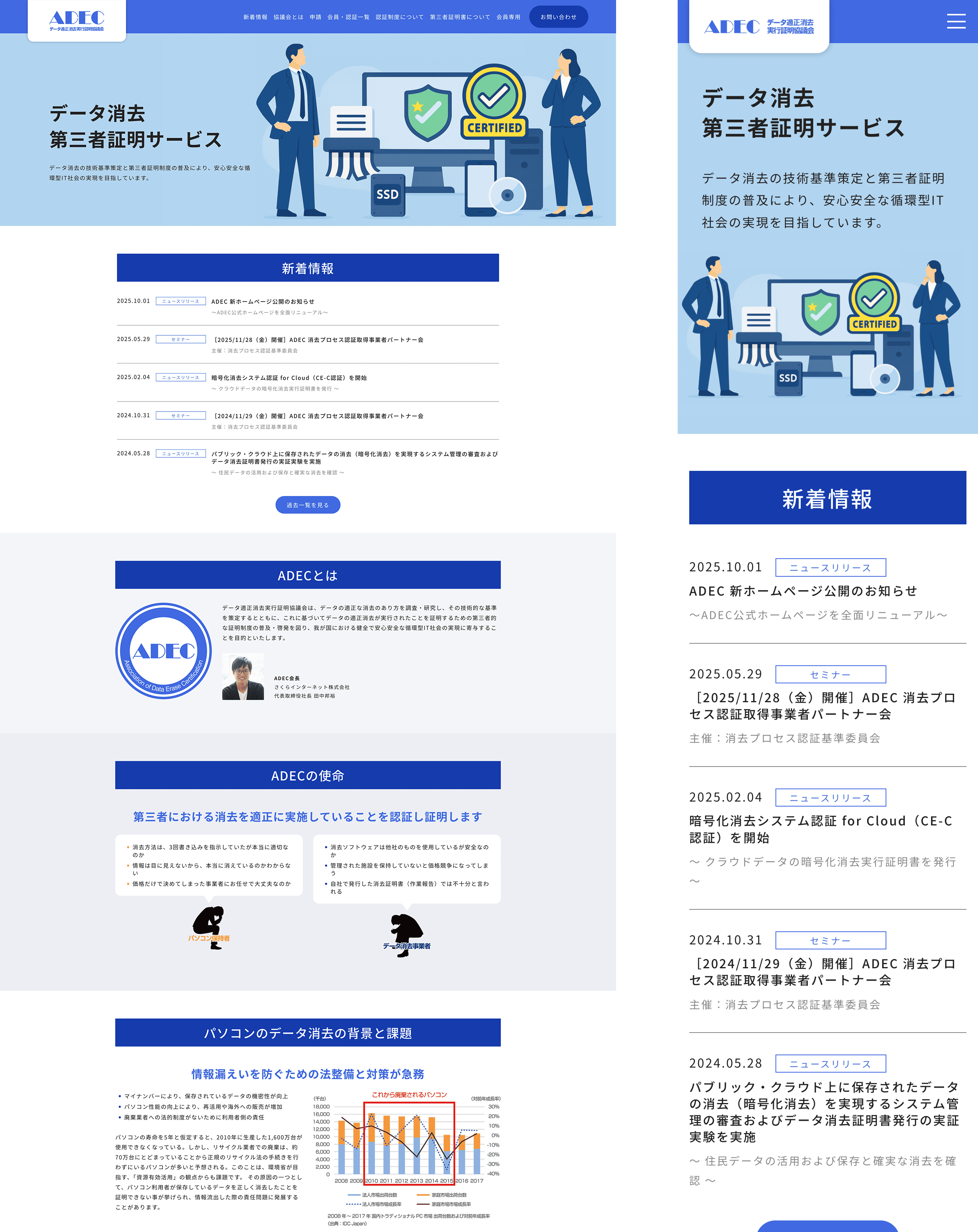 データ消去の技術・プロセス認証制度概要や申請手続き、認証事業者一覧などをわかりやすく掲載し、利用者が必要な情報にスムーズにアクセスできる構成のサービスサイトを作成させていただきました。