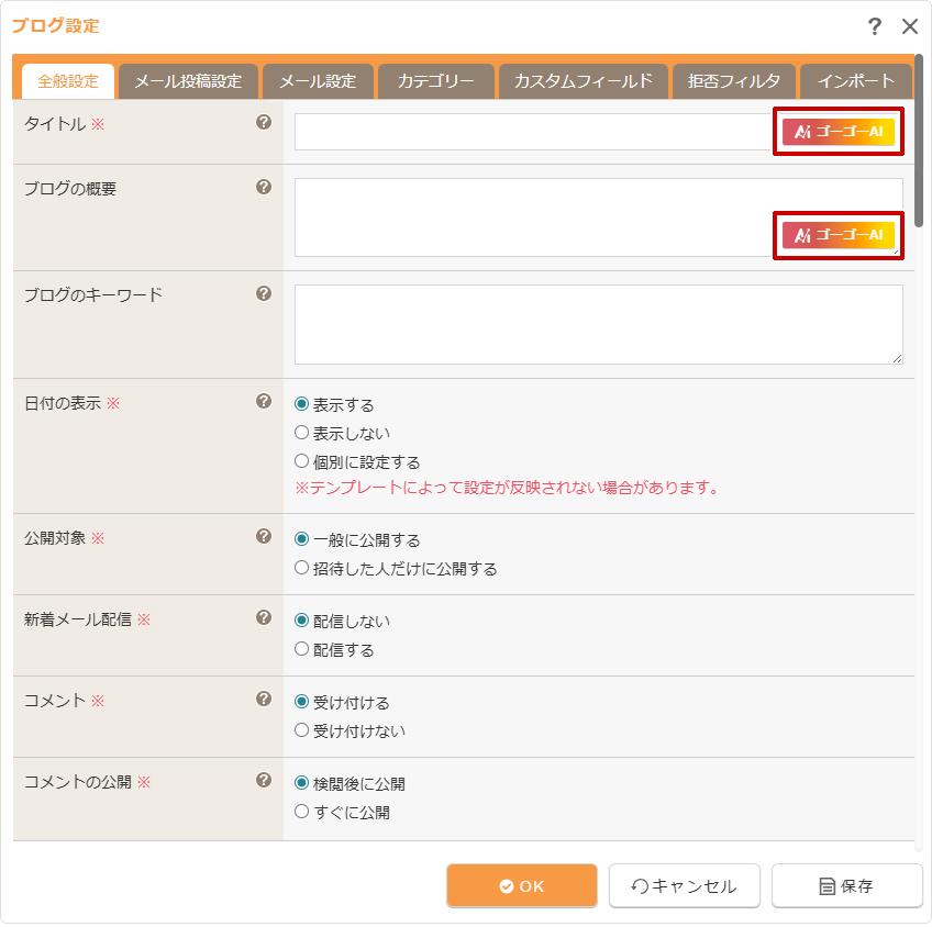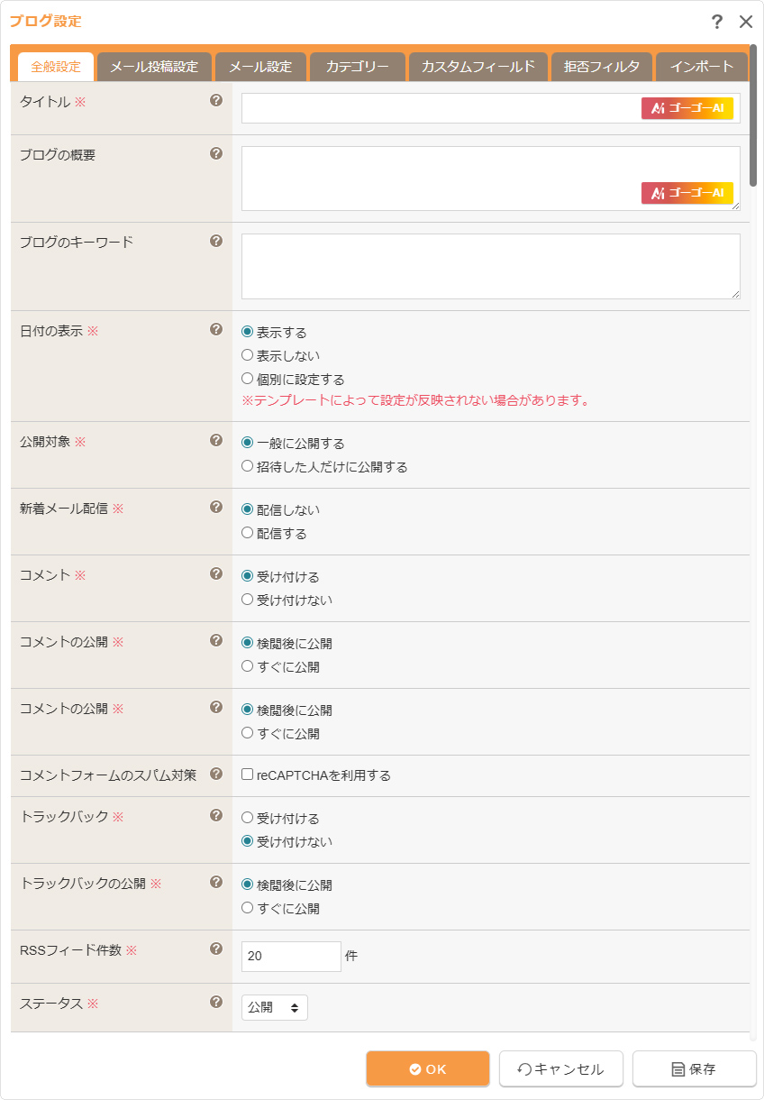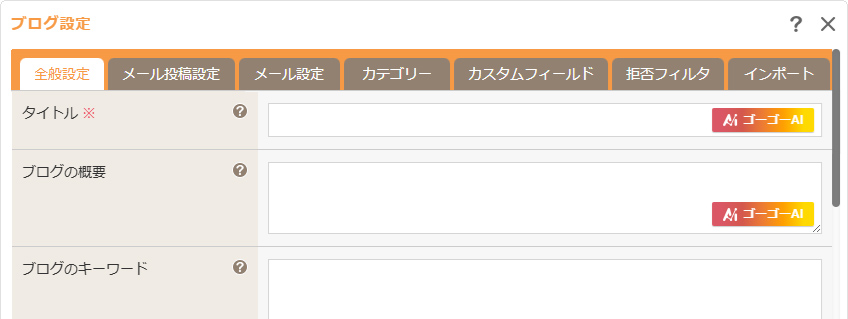 | タイトル | ブログのタイトルを設定します。 [AIアイコン] |