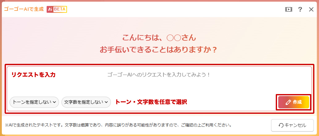 “AIダイアログ”が表示されます。作成したい内容を入力して[作成]ボタンをクリックします。詳しい操作は「ゴーゴーAIで生成(べータ版)」を参照してください。