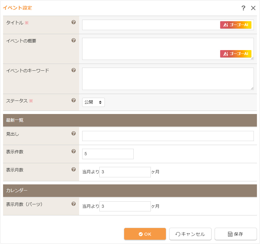 | 表示月数 | イベントパーツ『最新記事』で表示させる月数を設定します。表示月数と表示件数に一致する表示日以降のイベントが表示されます。 |