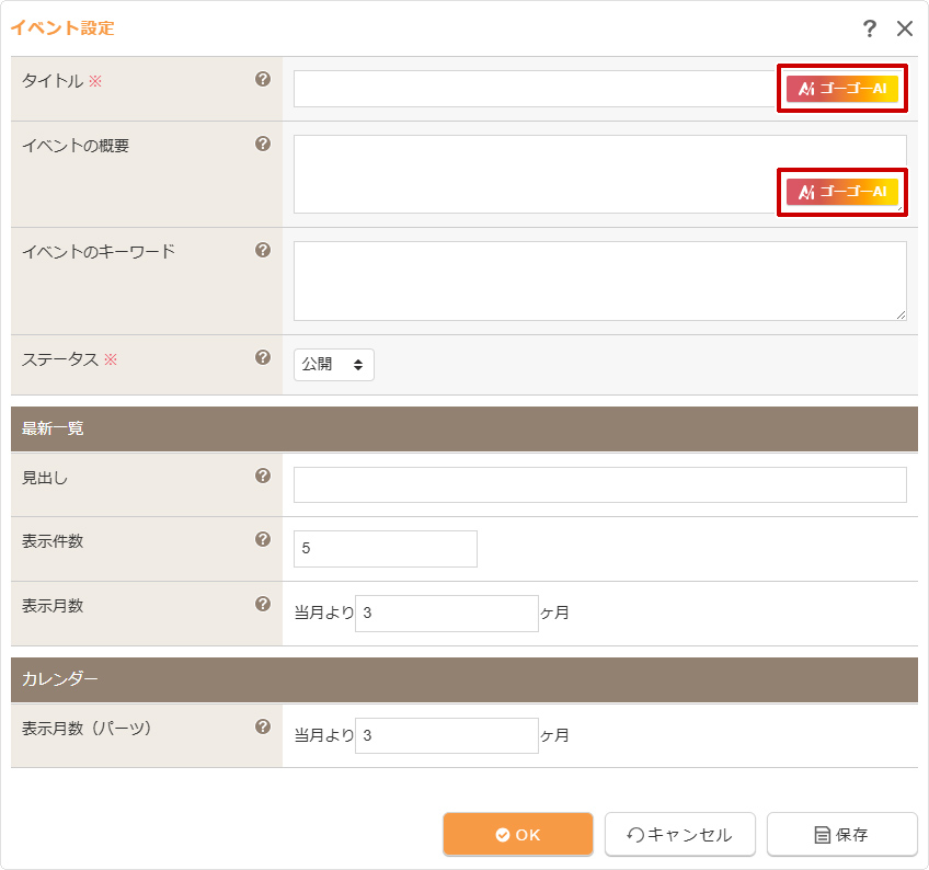 | タイトル | 該当イベントコンテンツのタイトルを設定します。 [AIアイコン] |