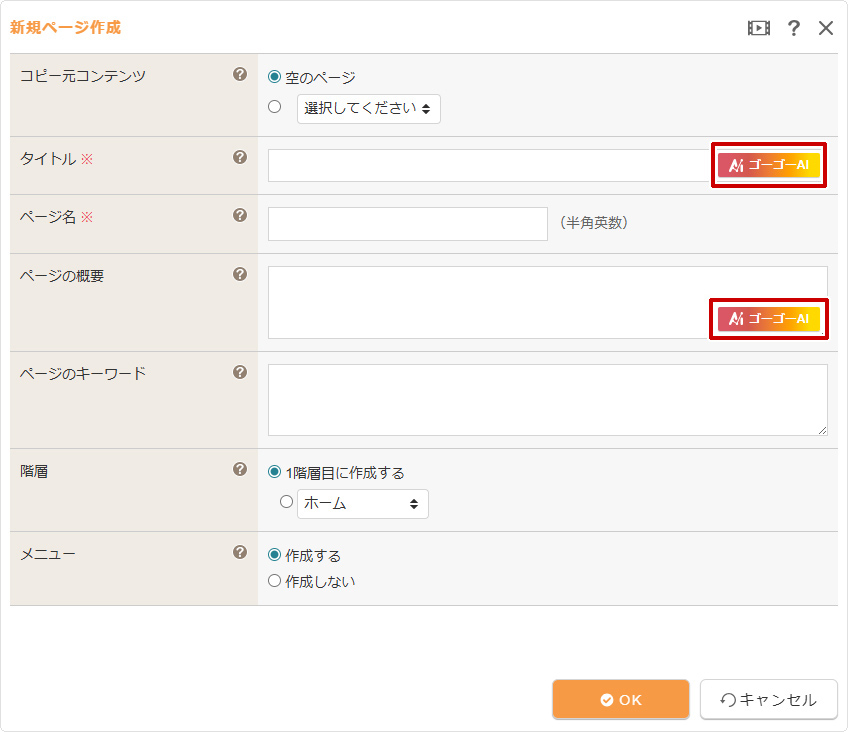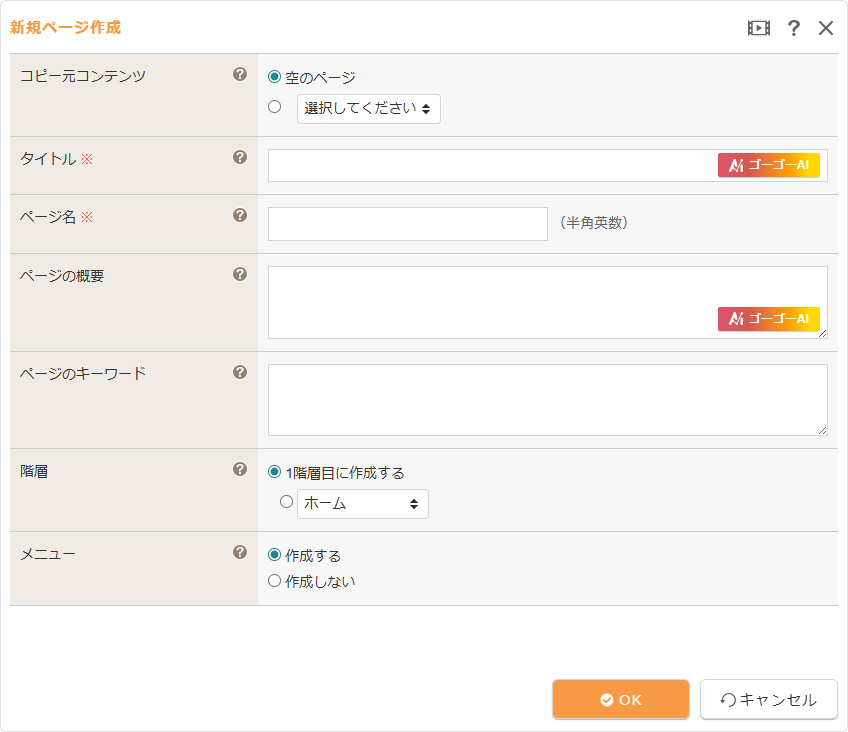 | ステータス | このメニューを一般に公開するかどうかを変更できます。「公開」を選択すると、サイト公開よって一般サイトで公開されますが、「非公開」の場合は編集サイトにのみ表示され、一般サイトにはメニューが表示されません。 |