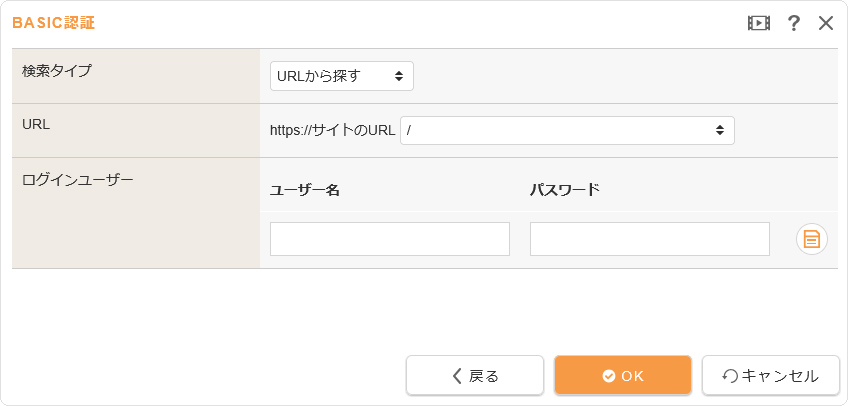 《検索タイプ》は「URLから探す」を選択し、BASIC認証を設定したいページのURLをリストから選択します。サイト全体にBASIC認証を設定したい場合は「/」を選択してください。