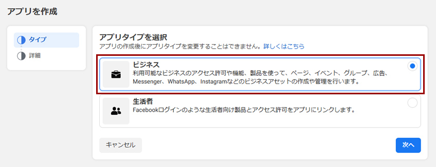 アプリタイプを選択 | 「ビジネス」を選択します。 |