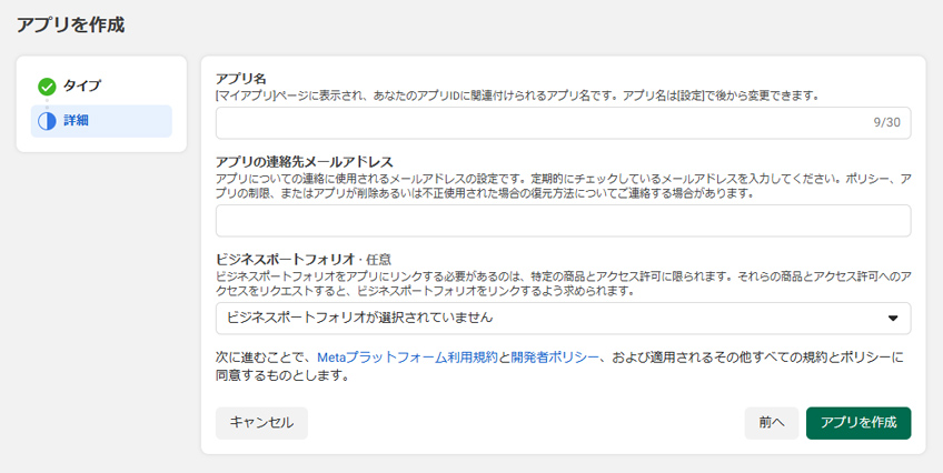 アプリ名、アプリの連絡先メールアドレスを入力し、[次へ]ボタンをクリックします。
