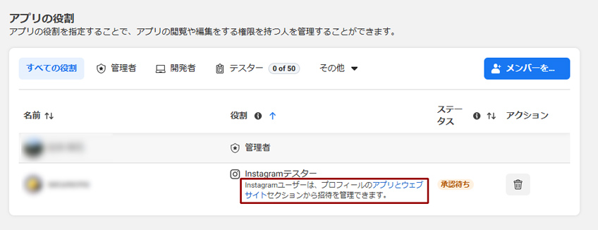 ⑥アプリの役割の画面で追加した「Instagramテスター」のステータスの「承認待ち」が消えていたら承認完了です。