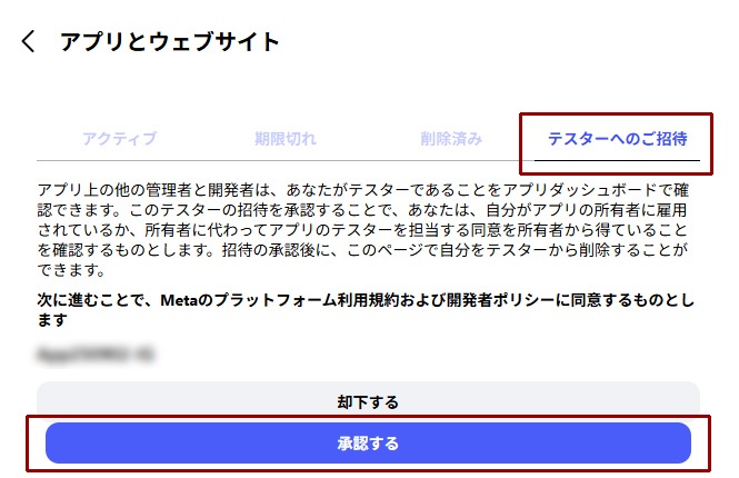 ⑤Instagramの設定画面の「アプリとウェブサイト」の「テスターへのご招待」タブをクリックし、追加したアプリ名の[承認する]ボタンをクリックします。