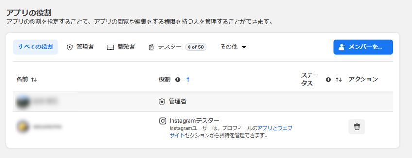 左側のメニューの[アプリの役割] → [役割]を選択し、アプリの役割画面に表示される[メンバーを追加]ボタンをクリックし、下記の手順でInstagramテスターを追加します。