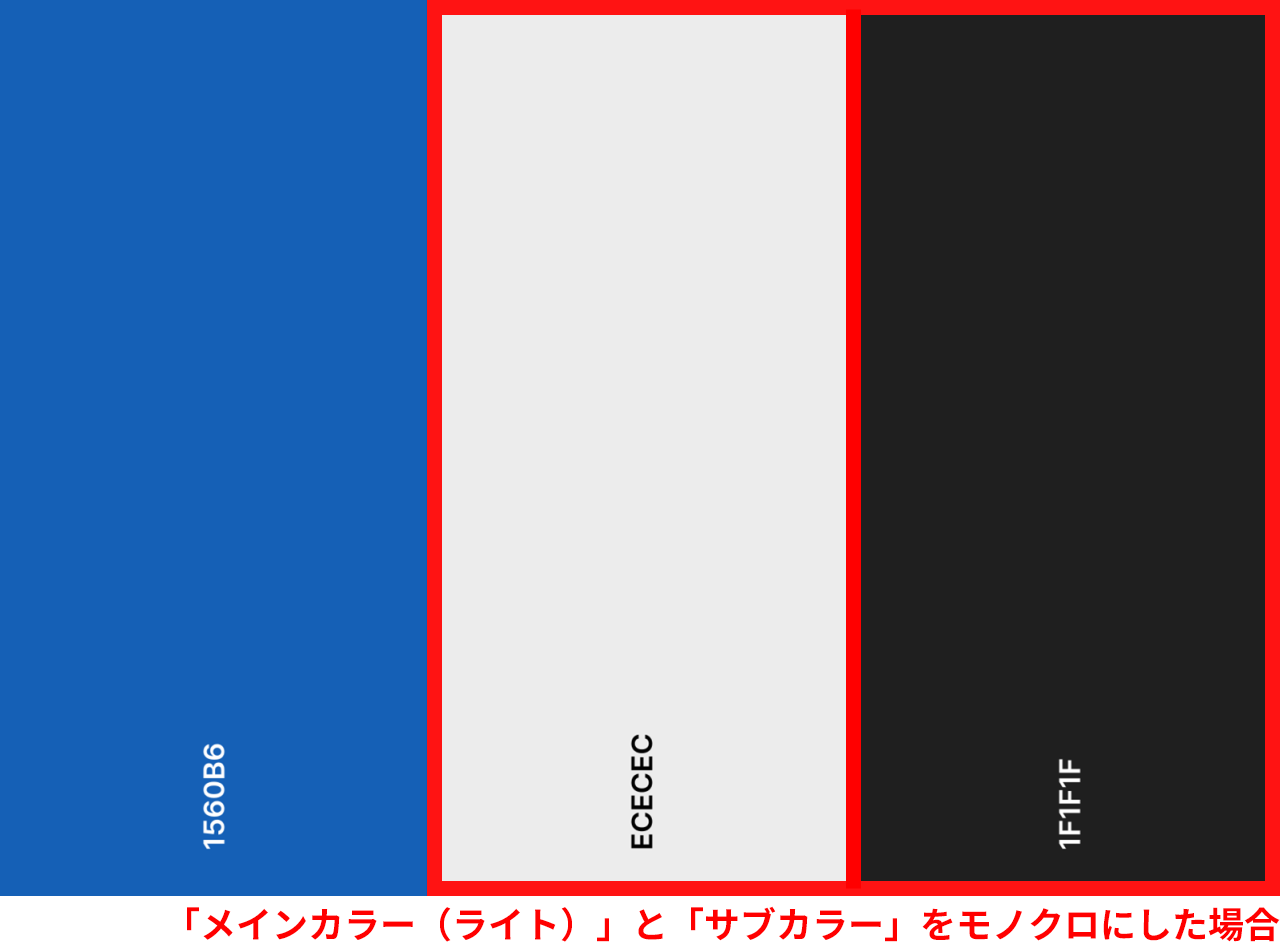 また、メインカラーが鮮やかな青や緑、赤などの色の場合、カチッとした印象のコーポレートサイトを作成したい場合は「メインカラー(ライト)」には色味を足さずに薄いグレーに、「サブカラー」を黒に近い濃いグレーにすると引き締まった印象になります。