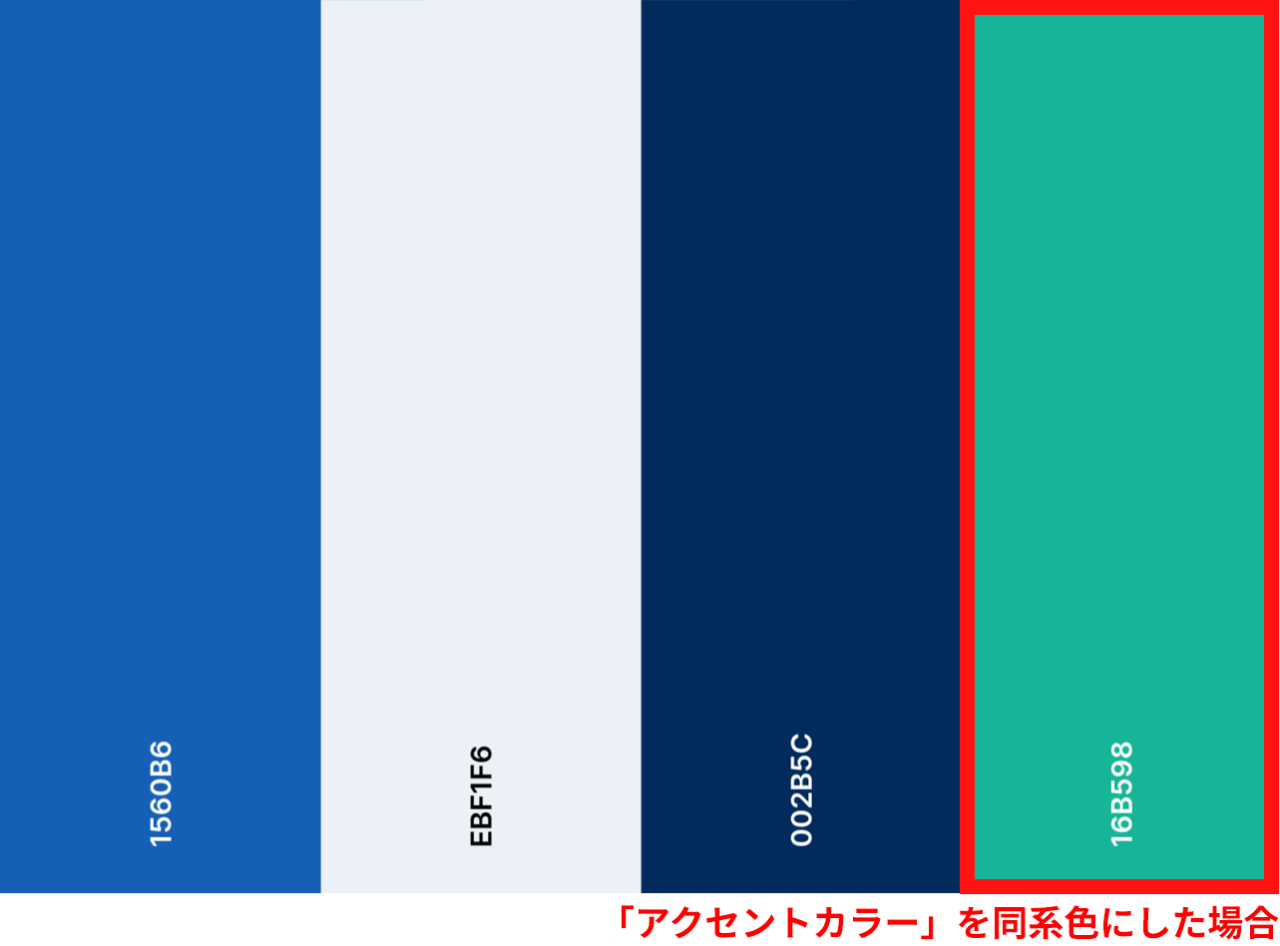 すべて同系色だとボヤけてしまうので、「アクセントカラー」だけは、「メインカラー(ダーク)」の反対色(補色)を選ぶのがポイントです。