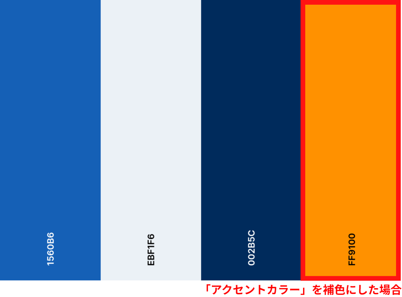 ただし、どうしても派手になってしまいますので暖色系は使用したくない場合は同じ程度の明るさの同系色(「メインカラー(ダーク)」が青なら緑)を選ぶと良いでしょう。