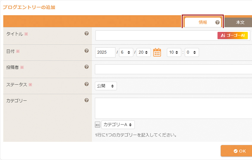 ブログエントリー【情報】タブ内の《タイトル》にエントリーのタイトルを入力し、《カテゴリー》にブログのカテゴリーを登録します。